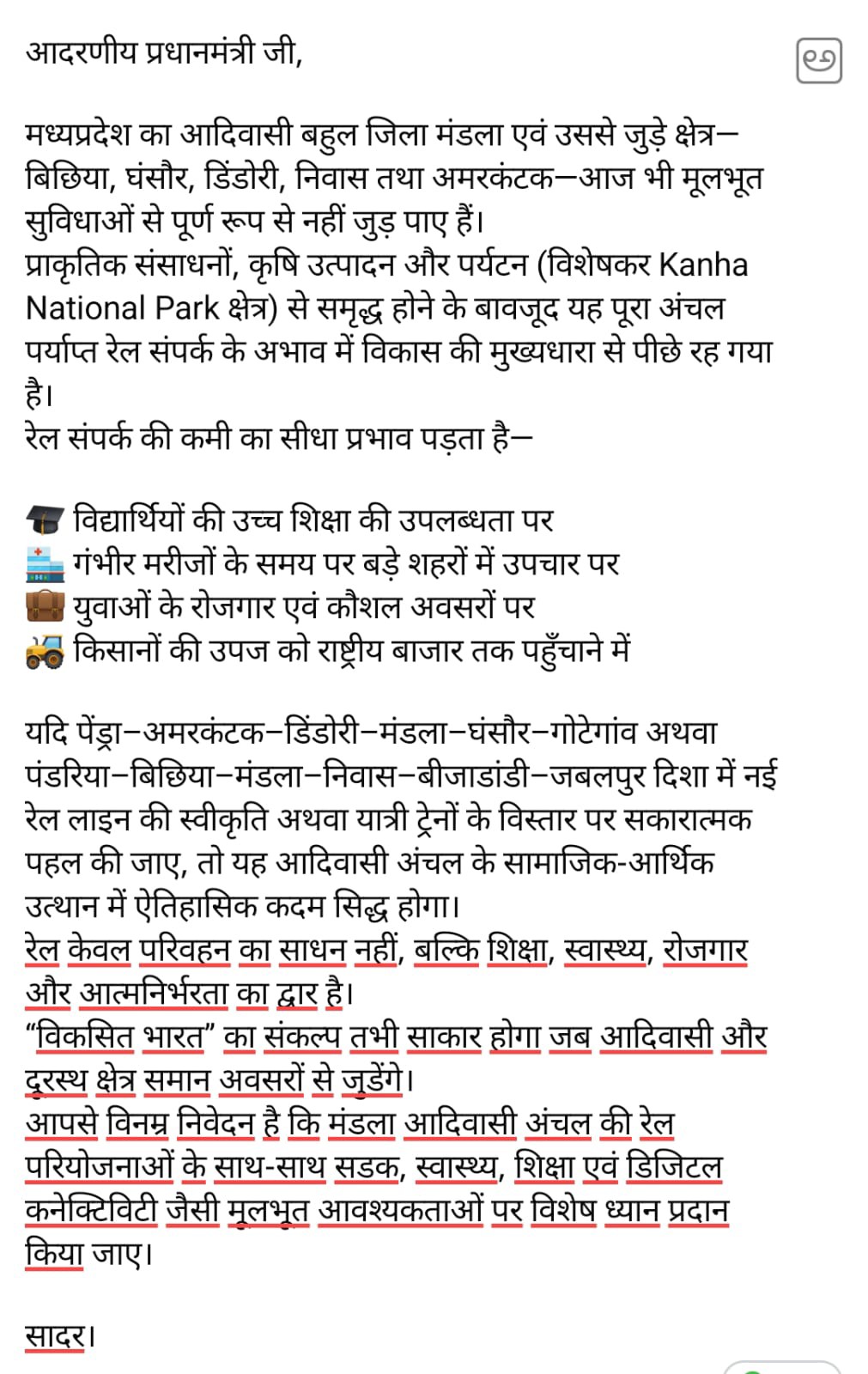 यदि पेंड्रा–अमरकंटक–डिंडोरी–मंडला–घंसौर–गोटेगांव अथवा पंडरिया–बिछिया–मंडला–निवास–बीजाडांडी–जबलपुर दिशा में नई रेल लाइन की स्वीकृति अथवा यात्री ट्रेनों के विस्तार पर सकारात्मक पहल की जाए,